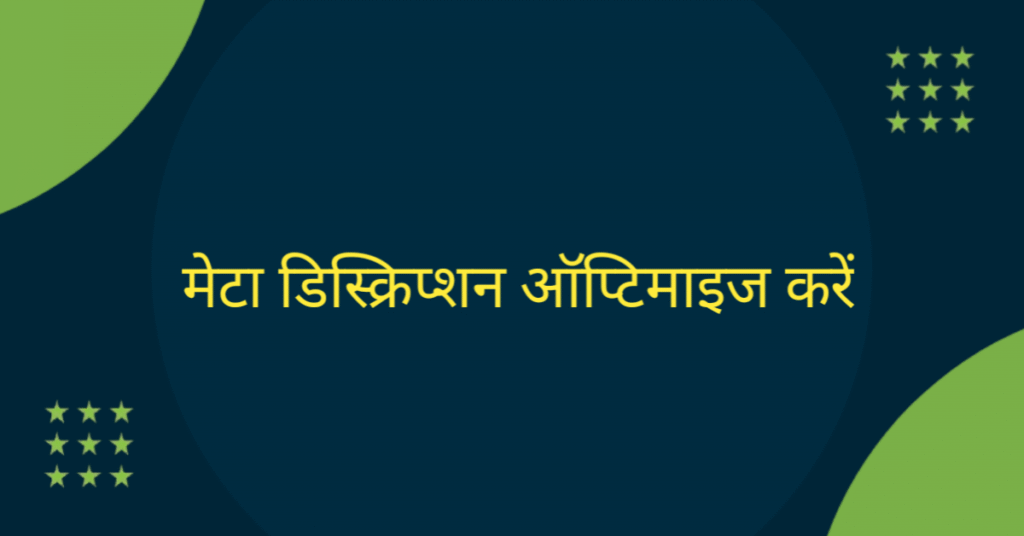 मेटा डिस्क्रिप्शन वह छोटा विवरण है जो Google सर्च रिजल्ट में दिखता है। यह सीधे रैंकिंग फैक्टर तो नहीं है, लेकिन अच्छा मेटा डिस्क्रिप्शन क्लिक-थ्रू रेट बढ़ाता है। मेटा डिस्क्रिप्शन को 150–160 अक्षर के बीच रखें और उसमें मुख्य कीवर्ड शामिल करें।