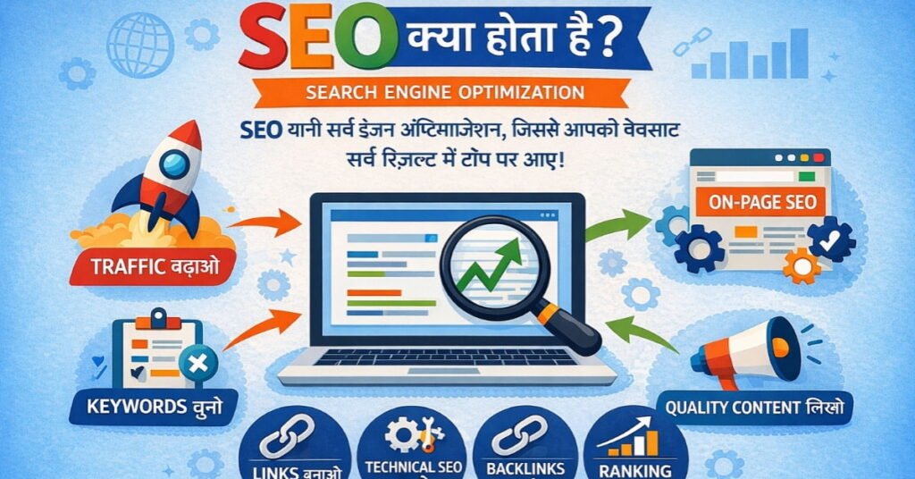 SEO क्या होता है? यदि आप Blogging करना चाहते हैं तो SEO सीखना अनिवार्य है ।आपने कभी सोचा है कि जब आप Google पर कुछ ढूंढते हैं, तो वेबपेजेस किस आधार पर ऊपर-नीचे होते हैं? इसका जवाब है SEO। SEO यानी Search Engine Optimization, यह एक तरीका है जिससे आप अपनी वेबसाइट को Google के सर्च रिजल्ट्स में ऊपर लाने की कोशिश करते हैं। सरल भाषा में, अपनी साइट की क्वालिटी और कंटेंट को बेहतर बनाकर उसे सर्च इंजन में ऊँचे रैंक पर रखना ही SEO है। इस लेख में हम जानेंगे कि SEO क्या है, यह कैसे काम करता है, इसके मुख्य प्रकार कौन-कौन से हैं, और 2026 में SEO क्यों ज़रूरी है।